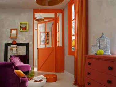 La peinture de ce salon mise sur le contraste entre un effet matière au rendu sobre et les couleurs peps qui l’entourent. Aux murs, un enduit décoratif effet béton appliqué à la taloche d’un gris pastel et finition mate qui s’illumine auprès d’une peinture orange vif utilisée sur les boiseries et pour repeindre la commode. Le rideau joue également la couleur avec une cotonnade du même orange. Le violet des deux fauteuils, les touches discrètes mais efficaces de vert complètent cette harmonie de couleur pour un salon lumineux et contemporain. Réf. enduit décoratif Industrie Maison Déco couleur platine.Prix : 49.90 € le pot de 5kg.