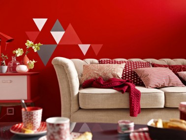 Faire le choix d’une peinture de couleur vive dans le salon c’est tout à fait possible lorsque celle-ci est adoucie par des couleurs claires. Dans ce salon, l’intensité de la peinture rouge est à la fois renforcée par un décor réalisé au pochoir avec une peinture grise, un blanc nuancé et un rouge plus clair et tempérée par les touches de blanc et d’écru du mobilier et du canapé. Couleur Peinture : Rouge Kyoto moyen collection Couleurs du Monde Dulux Valentine.