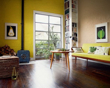 Une peinture jaune acidulé sur une mur du salon réveille la dominante de couleurs beige et les teintes naturelles. Peinture Dulux Valentine