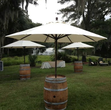Un tonneau transformé en pied de parasol