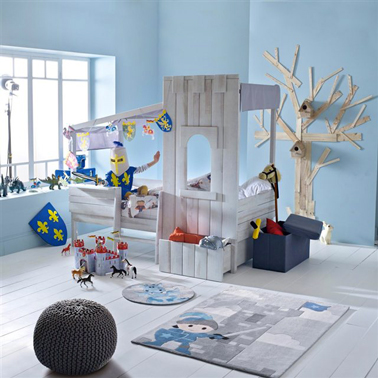 Avec ce lit en forme de château fort votre petit guerrier va imaginer des aventures extraordinaires. Côté pratique il pourra ranger ses jouets dans le tiroir sous la tour. Cette cabane magique est en pin brossé patiné gris clair vernis polyuréthane, une toile de coton de même couleur fait office de toit . Dimension totale du lit  L 201 sur 113 cm H181 cm. pour un couchage de 90 x 190 cm Réf : Lit enfant Zeya La Redoute.