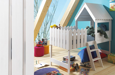 Telle une vraie petite maison, un lit cabane enfant avec sa fenêtre et ses deux grandes portes que l'enfant ferme à loisir pour jouer dans sa chambre. Au dessus du matelas, une table de nuit bien pratique pour placer sa veilleuse et ses peluches à l'intérieur de la cabane