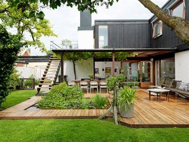 Pour un petit coin intime afin d'installer sa terrasse, l'arrière de la maison est l'endroit idéale ! Une jolie terrasse en bois pour prendre les repas à l'extérieur l'été
