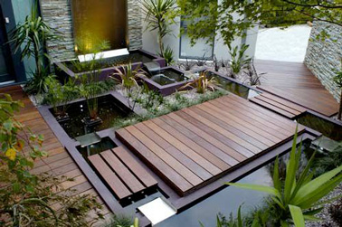 Sur la terrasse en bois, un jardin zen s’est fait sa place avec des carrés de plantes vertes et un petit bassin structuré avec la rigueur à la japonaise modernisée par des planches d’iroko et de l’ardoise anti-dérapante. Au final, une terrasse et qui ne manque pas de charme et d’originalité avec des matériaux sobres et nobles.
