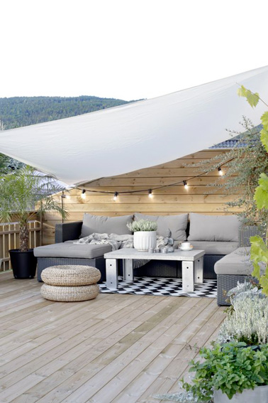 Pour se protéger du soleil et se crée un petit cocon douillet, rien de mieux qu’un voile d’ombrage, c’est utile et super déco à l’extérieur. Une terrasse et son élégant salon de jardin en L, des coussins de sol en coco, illuminés dès la nuit tombante par une guirlande scintillante.