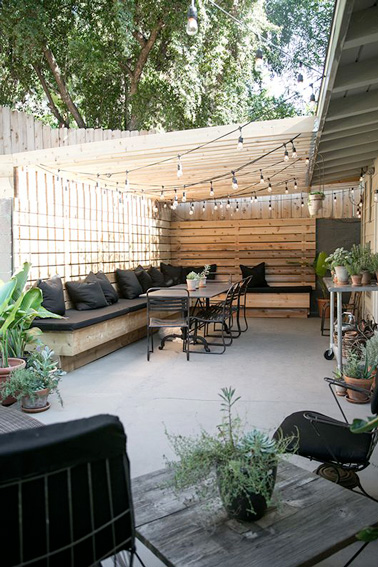 Pouvoir aménager sa terrasse sous le patio c’est une opportunité à saisir pour créer un espace déco où tous les éléments, salon de jardin, salle à manger, voire cuisine d’été s’assemble dans un même endroit. Sur cette terrasse, une banquette réalisée sur mesure assure le confort et se prête à accueillir de nombreux convives. Des guirlandes lumineuses suspendues pour les soirées d’été qui se prolongent sur la terrasse, et bien sûr les plantes en pot pour parfaire l’ambiance.