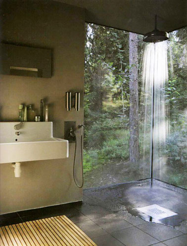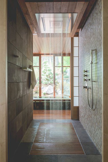 Vue sur le jardin depuis la douche italienne d’une salle de bain zen
