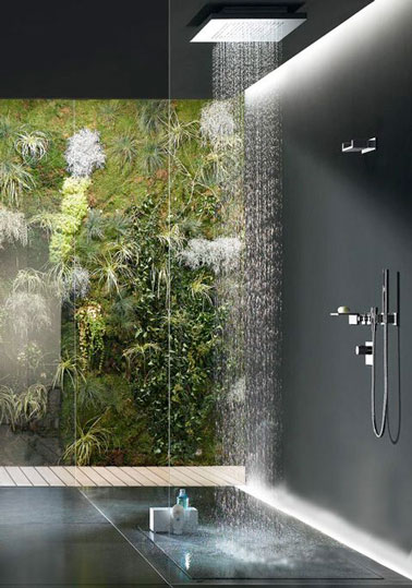 On adopte le total look béton ciré dans la salle de bain italienne ! Une déco design et épurée pour une salle de bain ouverte sur le jardin soulignée par un pommeau en pluie tropicale et un receveur extra plat à fleur de sol. Le summum du confort et dans une salle de bain luxueuse ouverte sur un magnifique mur végétal.