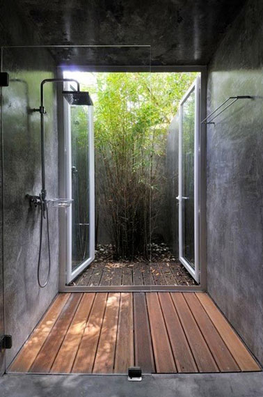 Ouverte sur un espace aménagé en véritable petit jardin zen avec un gros buisson de bambous, l’aménagement de cette salle de bain italienne à tout pour faire rêver ! Un mélange harmonieux de tadelakt gris anthracite et du parquet pont de bateau au sol, voilà une salle de bain originale favorisant les moments de quiétude sous la douche.