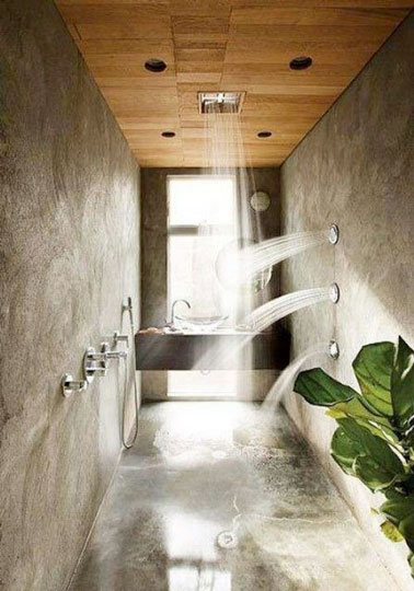 Total look béton ciré dans cette salle de bain design ! Avec vue sur l'extérieur et son pommeau pluie tropicale , on passerai des heures sous cette douche italienne