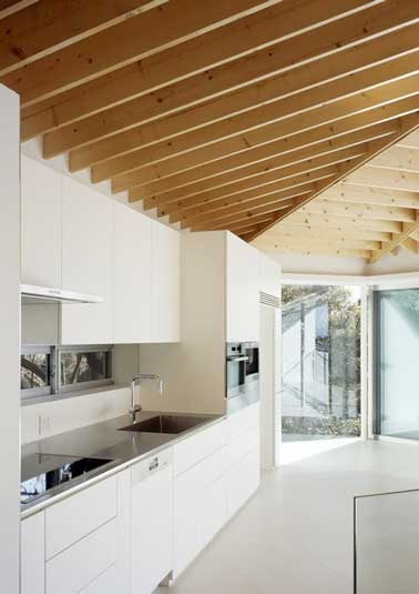 Avec ses éléments de cuisine blanc et son plafond en poutre de chêne clair, cette cuisine ouverte fait sa déco à la minute. Plan de travail et électroménager en inox ajoutent une note design.