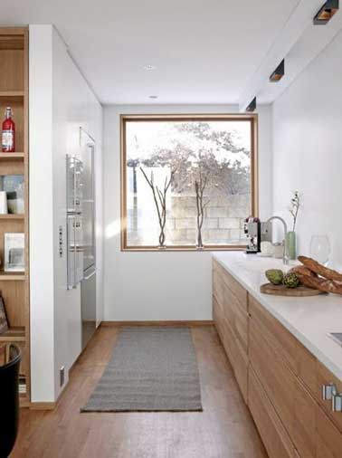 Cuisine en longueur déco style scandinave. Parquet et meuble de cuisine en bois assortis, plan de travail en bois laqué blanc et électroménager inox encastrés.