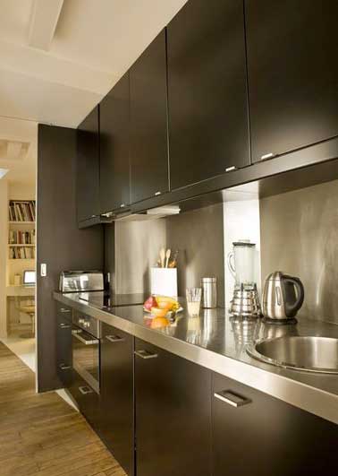Cuisine déco moderne avec plan de travail et crédence en inox sur mesure réveillés par une bande blanche. Meubles de rangement noirs et poignets aciers assortis.