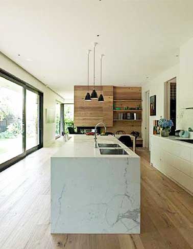 Cuisine minimaliste avec îlot central en marbre. Associé au parquet teck, meubles de cuisine en bois et une baie vitrée lumineuse pour plus de convivialité.