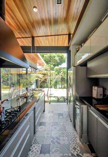 Dans cette cuisine verrière très lumineuse et ouverte sur le jardin, c’est le sol en carreaux de ciment qui assure la déco de la pièce ! Ses nuances grises et blanches se marient avec les meubles de cuisine gris et le plan de travail en bois laqué noir. La crédence cuisine en verre au dessus de la plaque de cuisson et les éléments électroménager en inox modernisent l’ensemble.