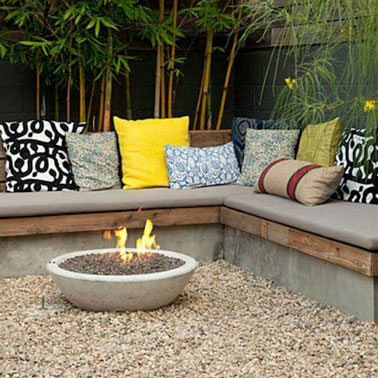 Voilà un banc réalisé en béton ultra confortable grâce à des coussins. Un lieu privilégiant les moments de convivialité sur la terrasse au milieu des bambous