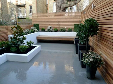 Avec son sol en béton ultra brillant, les rebords des jardinières blancs et une claustra pour se protéger du vis à vis, cette terrasse a tout de design ! Aménagé avec un long banc de jardin en teck encastré dans les jardinières, on se détend avec plaisir au coeur de ce petit coin de paradis en ville pour un moment de farniente en plein air !