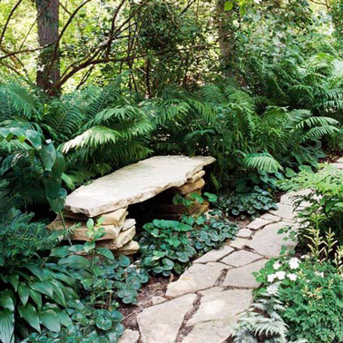 Installé au bord d’une allée de jardin, un petit banc plein de charme réalisé en empilant simplement des pierres plates identiques à celle de l’allée pour constituer un espace agréable où s’asseoir, en plein coeur de la verdure et au milieu des plantes vertes afin de se relaxer tranquillement loin du chahut et du bruit de la ville.