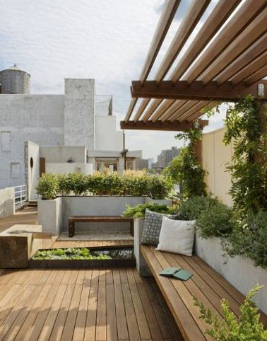 Sur cette terrasse sur le toit, le banc de jardin en bois fait un clin d’oeil aux lames en bois composite utilisées pour le sol. Avec de la verdure, des plantes, des jardinières hautes et une pergola en bois, cette terrasse donne envie de passer ses journées allongé sur le banc en profitant du soleil et de la vue.