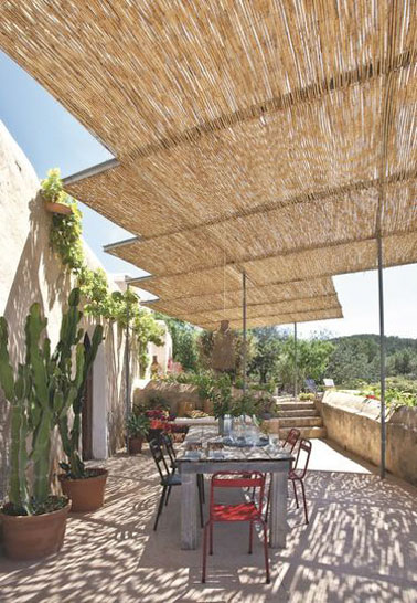 Repas conviviaux assurés sur la terrasse d’une propriété à Ibiza grâce à l’aménagement d’une pergola recouverte de canisses ! Protégée du soleil et offrant un espace d’ombre sur toute la longueur de la maison, cette terrasse vous ravira à coup sûr pour des moments uniques et plaisants dans le jardin.
