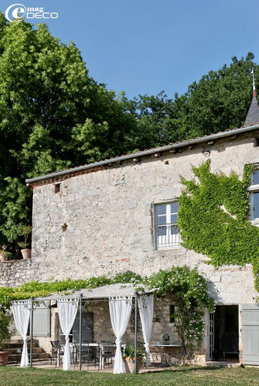 Afin d’abriter une terrasse plein sud dans une maison en pierre, créez une pergola avec un toit en tuile pour rester dans le style. Devant cette maison de campagne, la terrasse nous invite à nous asseoir à l’ombre de ses rideaux blancs pour des moments paisibles en toute tranquillité. On oublie pas de faire courir les plantes sur le toit de la pergola pour un rendu super joli et romantique !