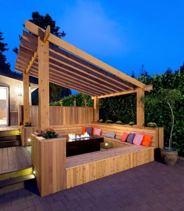Voilà une terrasse qui ne manque pas de style avec sa pergola en bois réalisée sur mesure combinée à un espace convivial autour d’un banc de jardin construit sur le pourtour de la pergola. Un petit cocon accueillant et déco pour partager des moments à l’extérieur  aussi bien en soirée qu’en journée !