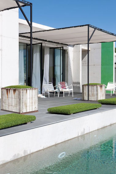 Au bord de la piscine, le soleil peut vite être trop brûlant et notre moment de détente devenir désagréable. Ici, on a pensé à tout ! La pergola à la structure métallique recouverte d’une toile fixée à l’aide de rivets aménage un espace ombragé au bord de la piscine en parfaite harmonie avec l’architecture de la maison.