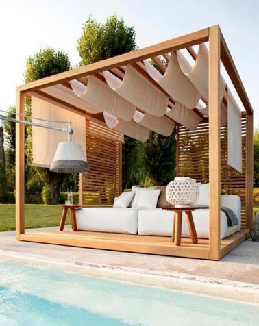 Rien de mieux qu'un petit espace agréable judicieusement ombragée par une pergola en toile devant la piscine pour faire trempette à l'abris des rayons du soleil