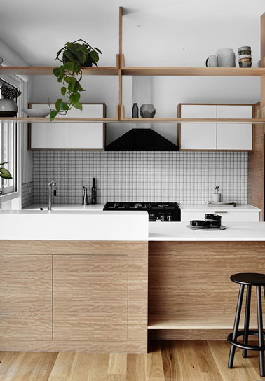 Du carrelage adhésif en crédence dans une cuisine blanche et bois