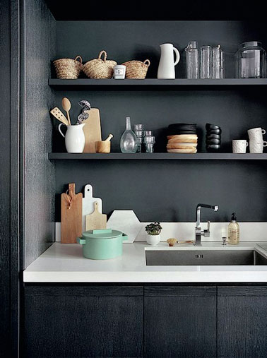 Contraste élégant dans cette cuisine coquette où un plan de travail blanc est joliment mis en valeur par une crédence peinte en gris anthracite ! Une déco chic soulignée par un pan de mur peint en gris brillant, à adopter pour tous les styles de cuisine !