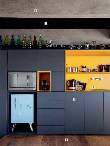 Association parfaite du bleu canard et du jaune soleil dans cette cuisine moderne au sol en parquet qui ne manque pas de style ! Une crédence peinte pour donner du peps et des bouteilles colorées en déco qui donnent du tonus et du dynamisme à la cuisine.