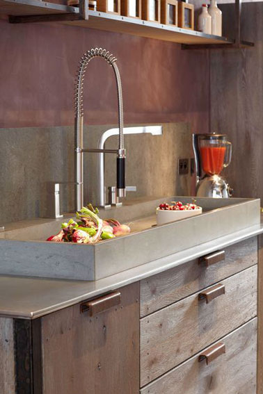 On craque à coup sûr pour le charme absolu de cette cuisine donnée par une crédence en pierre d’Anroche gris vert combinée à un beau plan de travail en étein ! Une déco cuisine originale et rustique renforcée par un large évier stylé ! WOODSTEEL, Xavie’s, 220 x 30 cm, 720€.