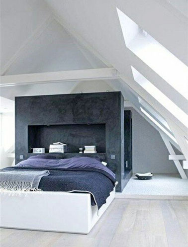 Aménager les combles pour en faire une suite parentale, c’est le bon plan pour optimiser l’espace et être à l’écart des bruits de la maison! Le charme de cette grande chambre blanche tient dans la cloison bleue la séparant de la salle de bain installée dans un cube. Une tête de lit originale certes, mais pratique avec son étagère qui dispense d’encombrer la chambre de deux tables de chevets. Une organisation idéale pour avoir un espace parental bien à soi, ultra déco avec un réel cachet.