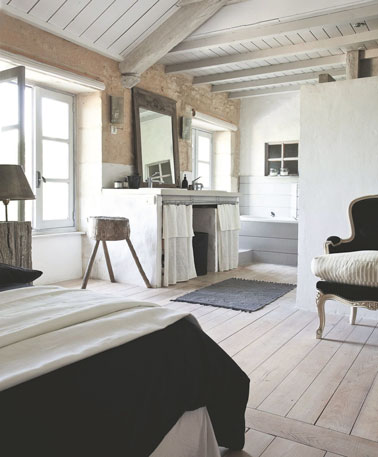 Rien n’est laissé au hasard dans la déco de cette chambre de maison de campagne. Couleurs naturelles et poutres apparentes s’allient pour une chambre charmante et lumineuse au sol en parquet blanchi. Sans oublier le grand miroir et le fauteuil style Louis XV tapissé en bleu pour faire écho au coussins de lit et au plaid et le clin d’oeil à la nature environnante avec le tabouret fabriqué à partir d’un rondin de bois.