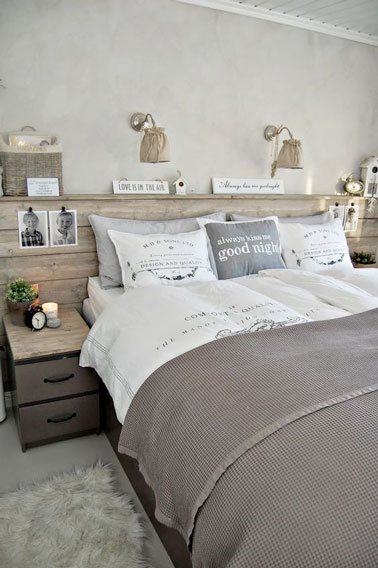 Pour aménager une chambre à la déco scandinave c’est pas sorcier ! Ici, murs gris perle, couleurs naturels, éléments en bois et tapis tout doux font parfaitement l’affaire. Le petit plus : Une déco réalisée dans un esprit récup avec une tête de lit palette et des appliques en argent chapeautées d’abats-jour en tissu, c’est toppissime et pas cher !
