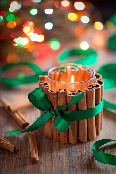 Décorez votre maison avec de jolies bougies au style naturel. Fixez des petits bâtons de cannelles avec de la colle forte autour d’un mini pot en verre, mettez une petite bougie chauffe-plat à l’intérieur et décorez le tout d’un joli ruban en satin coloré. Une bougie originale qui se fond parfaitement dans la déco de Noël pour une atmosphère tamisée.
