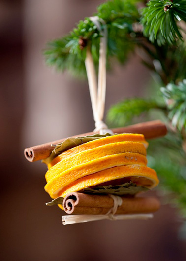 Pénurie de boules de Noël pour votre sapin ? Pas de panique ! Fabriquez de belles boules colorées hors du commun avec des tranches d’oranges, quelques feuilles vertes et des bâtonnets de cannelle. Fixez le tout avec une jolie ficelle et à vous la palme de l’originalité de la déco de votre sapin de Noël délicatement parfumée !