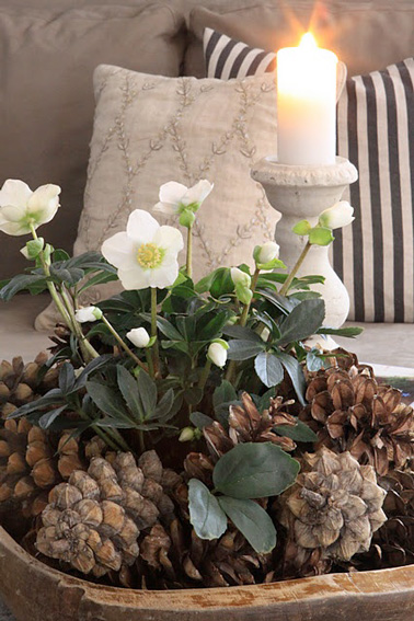 Créez une composition florale originale pour décorer votre table de Noël avec des pommes de pin ramassées dans la nature ou achetées au marché et des roses de Noël. Ajoutez des bougies, de la petite déco comme des boules colorées ou des petites guirlandes scintillantes pour souligner la magie des fêtes et égayer votre tablée.