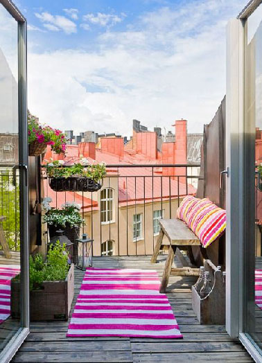 Sur un balcon d’à peine 1,5 m de large, l’unité du revêtement de sol avec le salon permet de casser la frontière entre l’indoor et l’outdoor, de supprimer la différence de niveau en posant les lames de bois sur des cales en plastique. L’ambiance déco s’arrange de la configuration difficile du balcon avec un banc et des jardinières en bois et touches de couleur qui égayent l’ensemble. Pinterest.