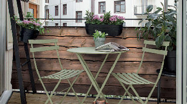Rapide à installer pour se protéger et vivre tranquille sur son balcon, des planches de bois brut posées sur la hauteur de la rambarde, un sol en lames de bois. Un salon de jardin de fer dans un tendre vert olive, un peu de verdure assurent la déco. Pinterest.
