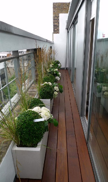Sur ce type de balcon qui ne peut servir qu’à admirer le coucher du soleil, un aménagement minimaliste est de rigueur. Un sol bois et des jardinières alignées le long de la rambarde compensent l’aspect froid des baies en aluminium. La répétition des boules de buis et des hortensias blancs renforce l’aspect épuré de la déco de ce balcon étroit.