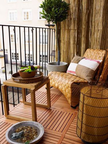 Des immeubles en béton ce n’est le paysage de rêve pour se délasser sur le balcon. Pour se créer un univers bien à soi, le canisse posé sur le pourtour de la rambarde demeure la solution la plus radicale afin de se protéger des vues plongeantes des voisins sur notre balcon. Des dalles bois pour recouvrir le sol, une tablette crochée sur la rambarde, et déjeuner tranquillement sur le balcon devient possible. Source : Lushome.