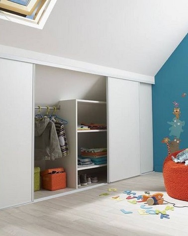 Les rangements dans une chambre mansardée peuvent aussi être cachés derrière des portes de placard. L’installation est rapide et peu coûteuse.