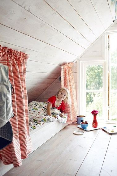 Le lit cabane, c’est vraiment trop top dans la chambre d’un enfant ! Et quand on l’aménage dans des combles, ça ne demande quasiment aucun travail de bricolage : placez simplement un matelas ou un lit le long de la pente du toit, fixez une tringle, placez voilages ou rideaux opaques et c’est fini !