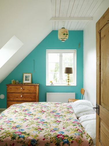 Dans ces combles réaménagées, la même astuce peut être utilisée pour égayer une chambre blanche et simplement décorée d’un beau mur turquoise qui donne envie de voyager au pays des rêves… Et de rappels de couleur sur la lanterne en papier et le couvre lit ! Une belle commode en chêne massif dont on a customisé les poignées vient apporter du cachet à la pièce. Cette couleur de mur vous plait ? Peinture Ripolin, nuance Vert Aspiration.