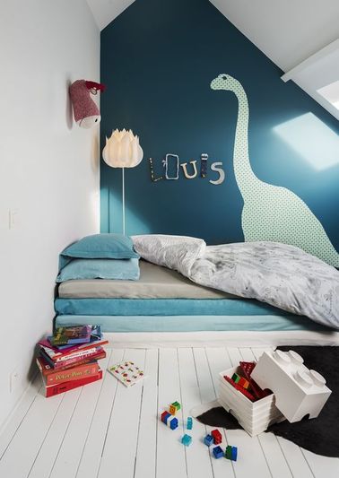 Peindre une petite chambre en blanc pour la faire paraître plus grande et lumineuse, vous connaissez déjà ! Ici, on est carrément allé jusqu’à peindre le vieux parquet ainsi que le plafond et les poutres apparentes des combles en blanc. Le mur du fond est peint dans un bleu canard et décoré d’un adorable dinosaure découpé dans du papier peint. Voilà une idée d’aménagement de combles pour créer une nouvelle chambre lorsque un enfant est en âge de prendre un peu d’indépendance sous le toit de Maman et papa. Pour refaire cette ambiance, peinture Dulux Valentine, coloris Catamaran.