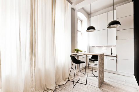 Pour concevoir l’aménagement de ce studio, le cabinet d’architectes 3XA en Pologne avait deux missions : Le rendre plus spacieux tout en séparant l’espace salon, cuisine et salle de bain et créer une chambre indépendante. Seule solution pour optimiser l’espace au sol, créer une mezzanine à mi-hauteur pour y installer la chambre et dédier les 29 m2 à la partie jour. L’escalier menant à la chambre permet de créer des rangements pour les livres et bibelots qui n’empiètent pas sur la surface. Pour aménager la salle de bain, un bloc a été monté en carreaux de plâtre ce qui permet d’isoler le salon tout en créant un petit couloir de distribution. La cuisine ouverte sur le salon offre tout le confort que l’on souhaite y trouver avec ses meubles et placards installés au maximum de la hauteur.