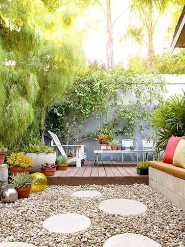 Si vous rêvez d’un jardin zen, profitez d’une grande terrasse pour aménager un petit espace avec des pas japonais comme ici. Installés à côté de la terrasse surélevée, ils inspirent détente et méditation et scindent la terrasse en deux espaces. Une partie bain de soleil avec des chaises longues et chiliennes et une partie zen avec plantes en pots et banquettes en ciment. Reproduisez cette ambiance en alignant des jardinières de bambous tout autour du mur de clôture et en installant une petite fontaine près de la table de jardin pour profiter du chant de l’eau à l’heure des repas.