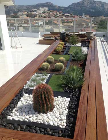 Le toit terrasse de cet appartement marseillais, tel un jardin zen, est aménagé avec un grand parterre de plantations de cactus et de plaques de schistes. Spécialement sélectionnés pour leur résistance au vent et aux embruns marins, ces différentes variétés de plantes sont structurées autour de galets blancs et noirs dans une grande jardinière en bois exotique de style contemporain construite sur mesure. Refaites la même chose en aménageant une composition florale symétrique dans des jardinières en bois.