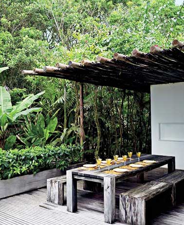 Un aménagement de terrasse que n’aurait pas boudé Robinson Crusoé ! Couverte d’une pergola en rondins de bois , elle abrite une table de jardin en palette et quatre bancs fabriqués avec le même bois. Si vous avez la main bricoleuse, vous pouvez faire la même chose sur votre terrasse et jouer les prolongations en montant une jardinière avec le bois restant. Un style facile à repiquer en réalisant votre salon de jardin en palette !